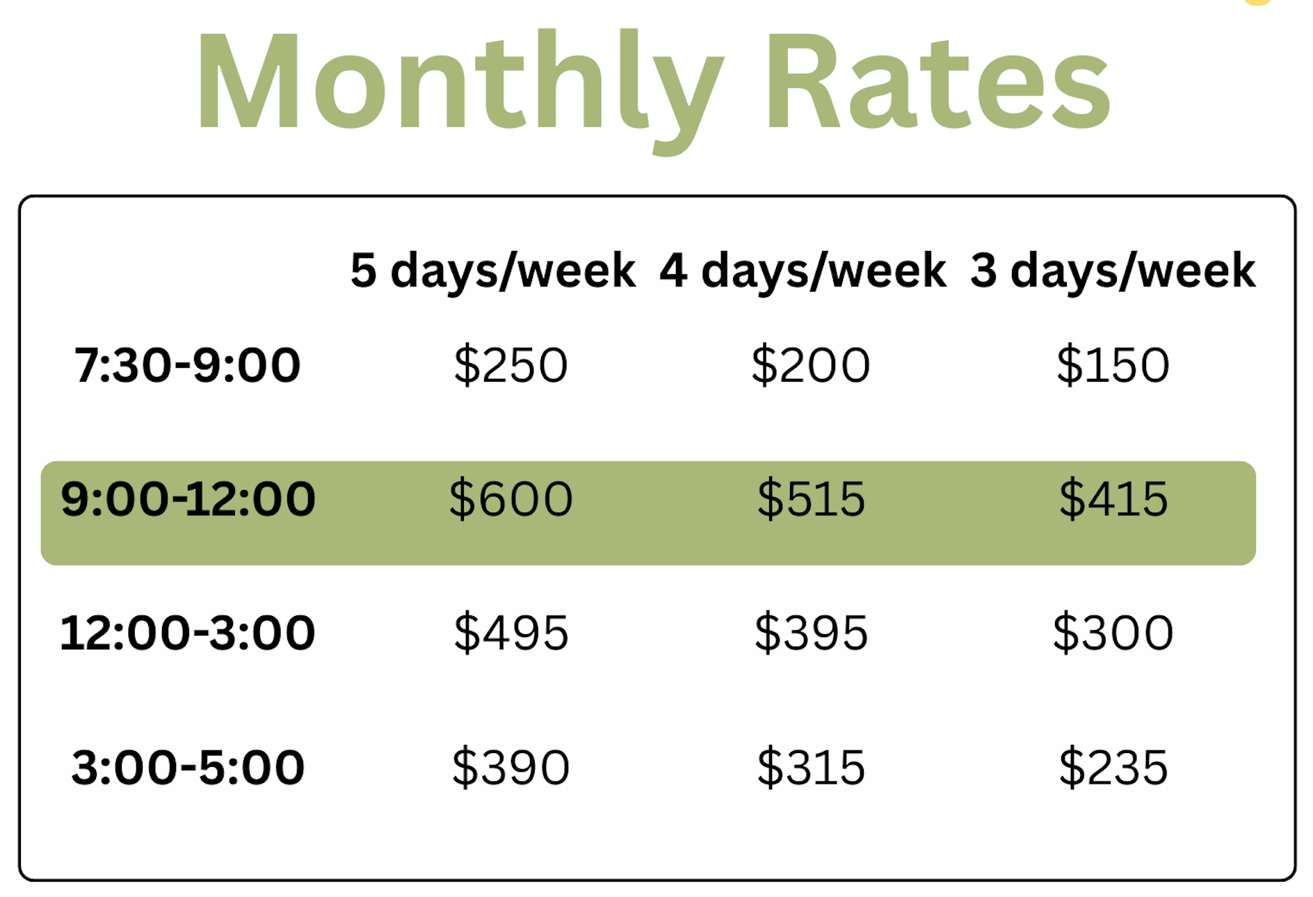 5 days/week (includes 3.5 hours on Wednesdays): $600